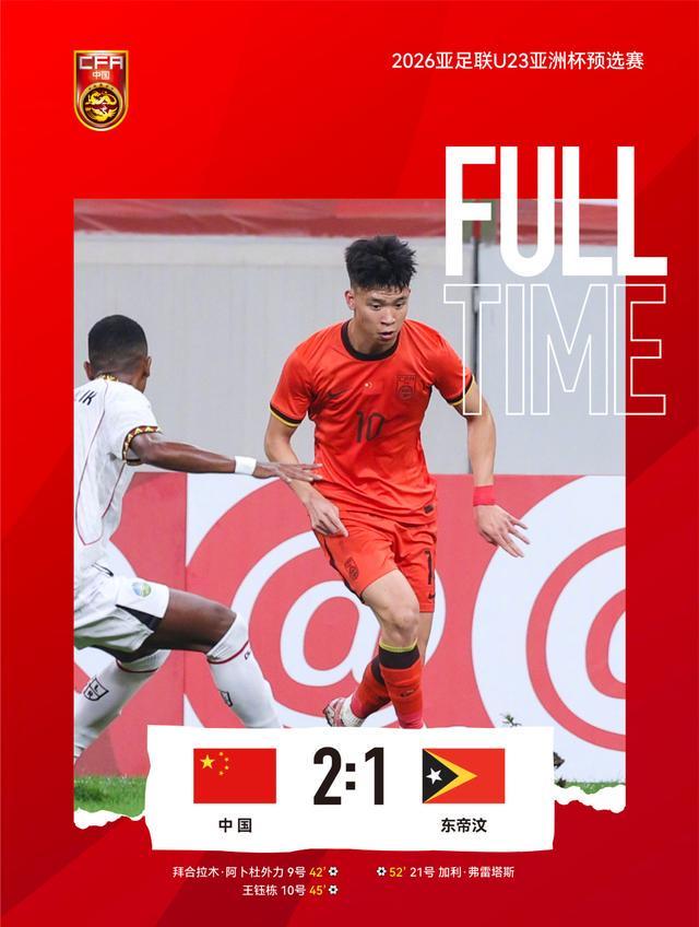 全场比赛结束,谁能想到,中国U23首战2-1险胜弱旅东帝汶U23,艰难取得U23亚洲杯预选赛开门红!