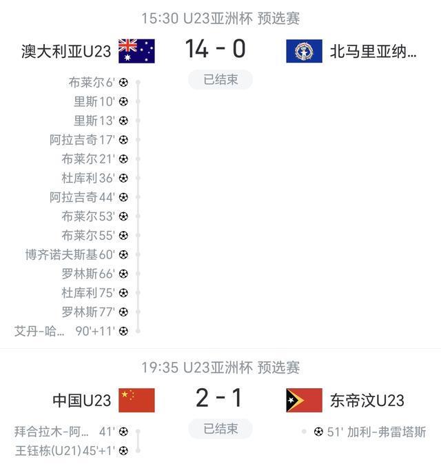 9月6日的第2轮,澳大利亚U23将对阵东帝汶U23,届时看袋鼠军团能进对面多少球。中国U23则将迎战北马里亚纳群岛U23,盲猜两连胜应该没啥问题吧……